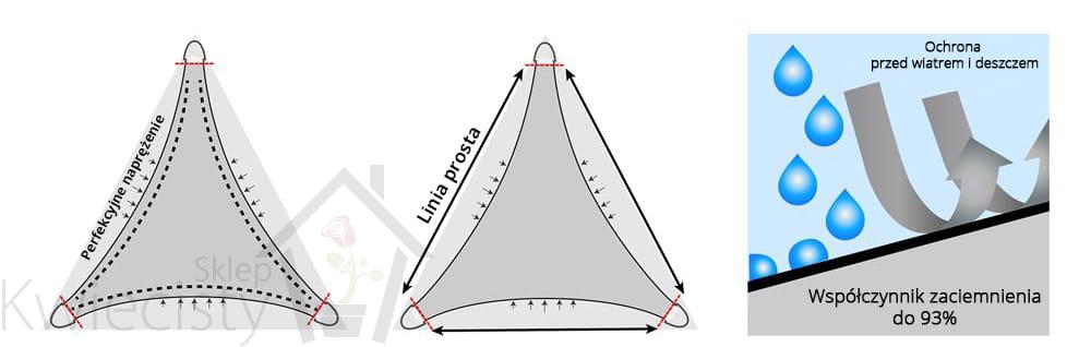 - Ze względu na wklęsły kształt żagli przeciwsłonecznych, naprężenie jest przenoszone na rogi zewnętrzne, dzięki czemu nie tworzą się nieestetyczne zagniecenia i zwiotczenia tkaniny.