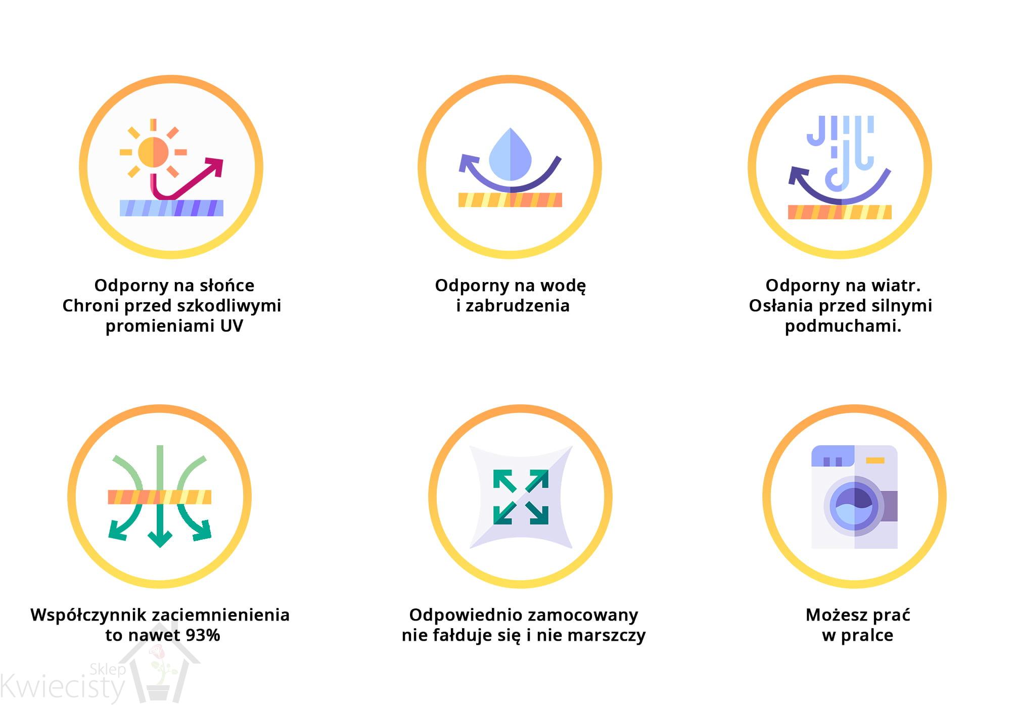 - Współczynnik zacienienia wynosi ok. 93% - chroni przed szkodliwymi promieniami UV, obniża temperaturę panującą pod żaglem, a jednocześnie zapewnia cyrkulację powietrza.