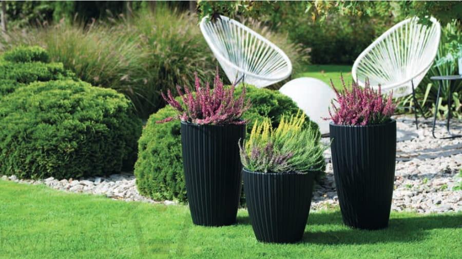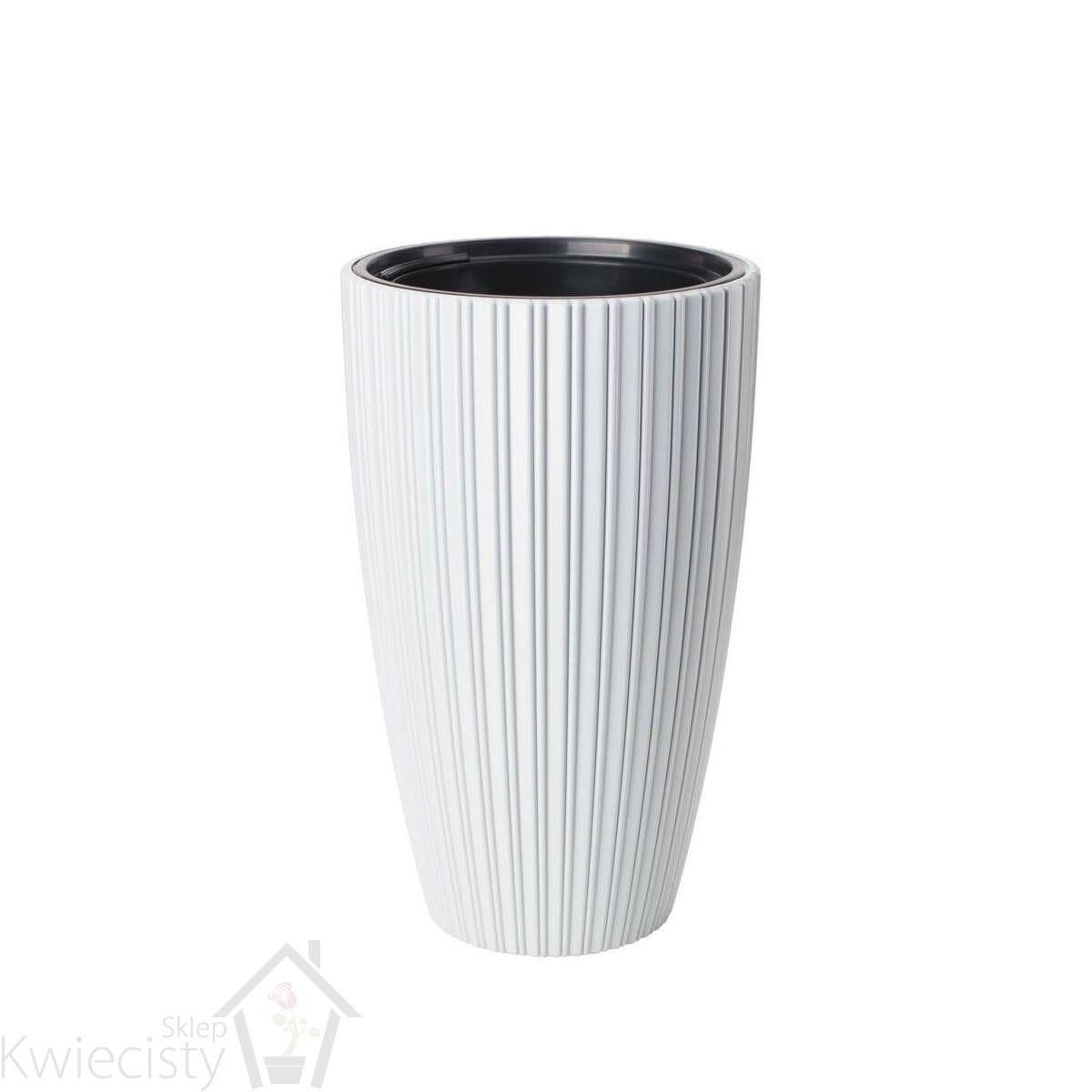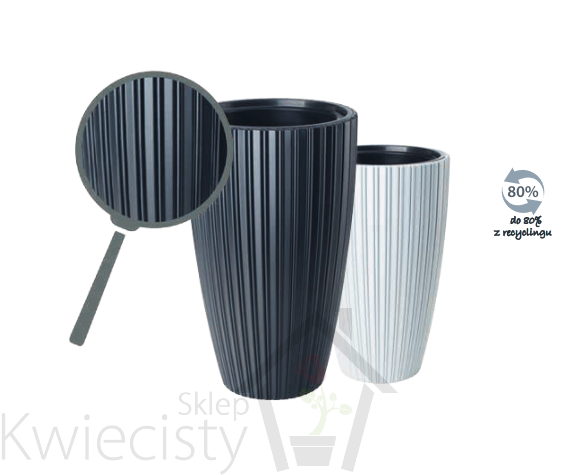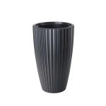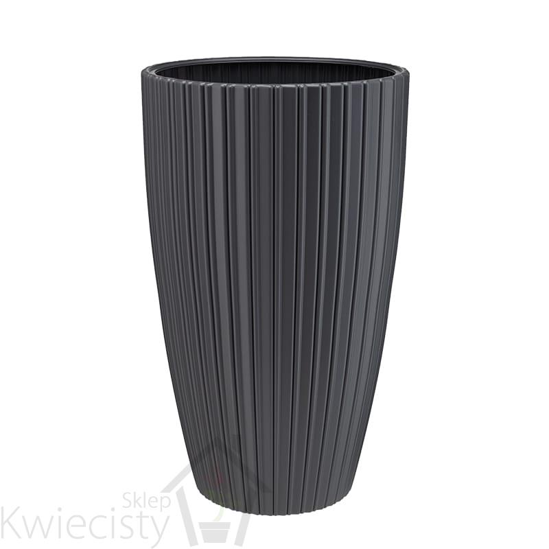 Wysoka, smukła, okrągła donica Mika Slim z dołączonym wkładem, o prążkowanej fakturze pionowych żłobień.