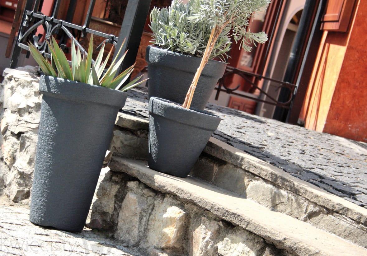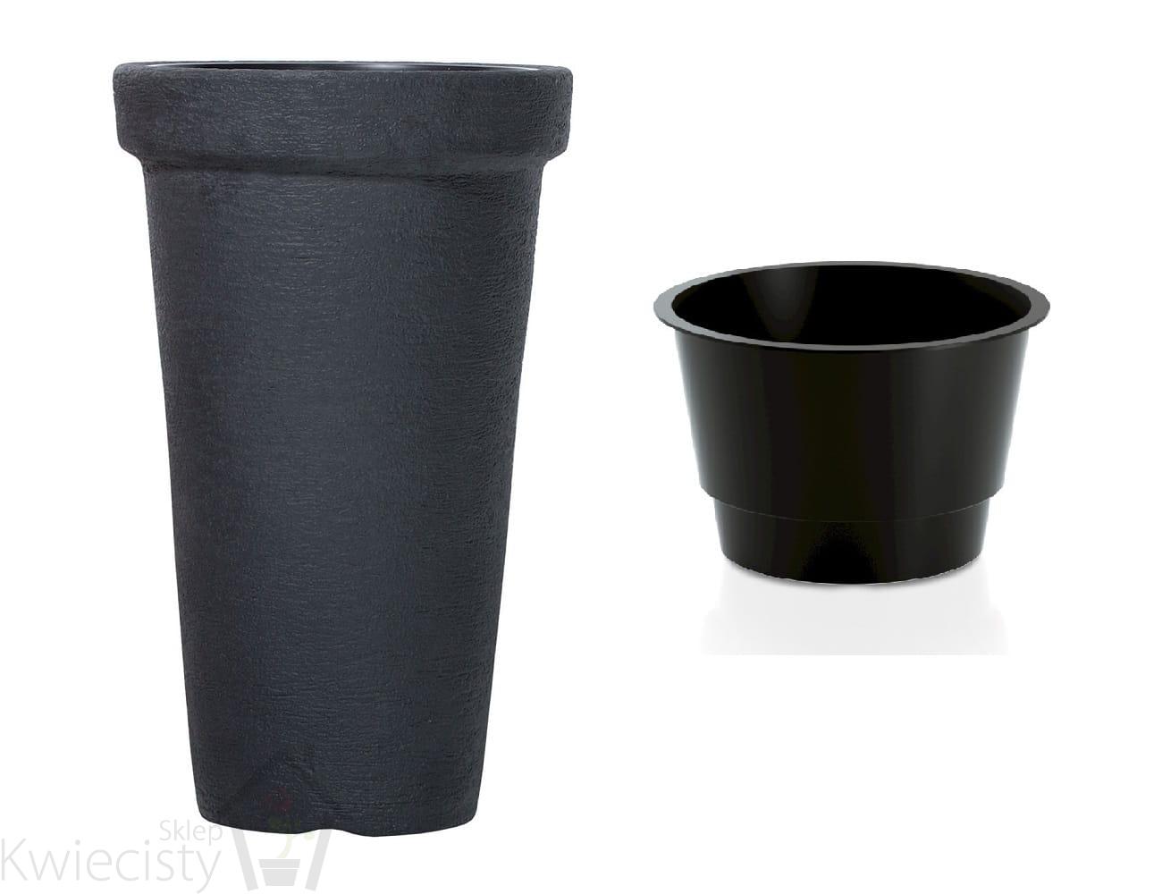 Wysokie, okrągłe doniczki z wkładem wewnętrznym. Wykonane z mrozoodpornego tworzywa sztucznego, sprawiającego wrażenie masywności o ciekawej, kamiennej fakturze.