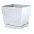 Kwadratowa doniczka o połyskującej powierzchni. Wykonana z tworzywa sztucznego.