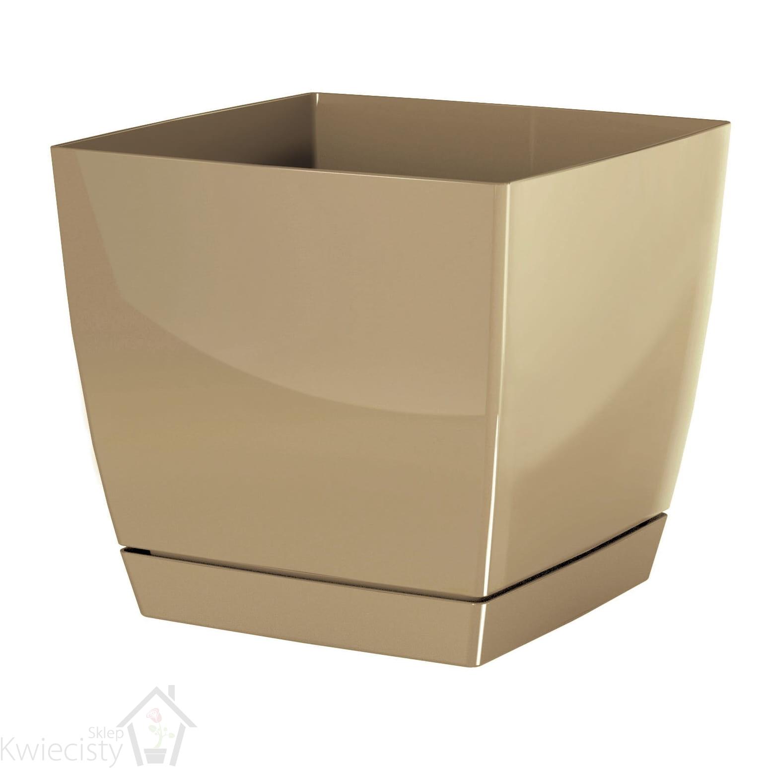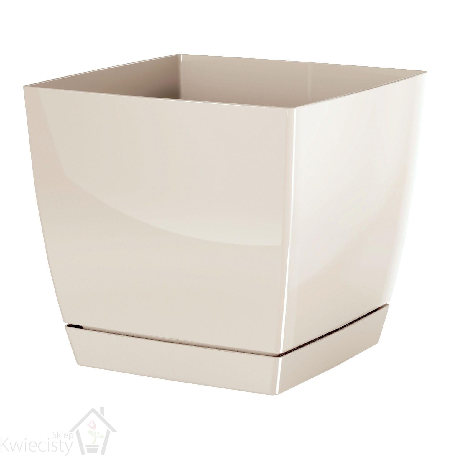 Kwadratowa doniczka o połyskującej powierzchni. Wykonana z tworzywa sztucznego.