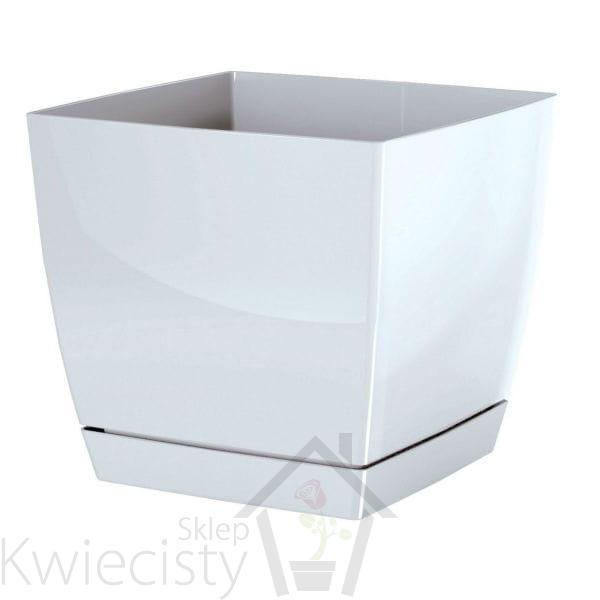 Kwadratowa doniczka o połyskującej powierzchni. Wykonana z tworzywa sztucznego.