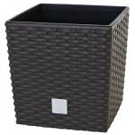 Kwadratowe doniczki z tworzywa sztucznego o rattanowym wyglądzie z wkładem wewnętrznym. Wymiary: 26x26x26,6 cm. Pojemność: 15,8 l. Wybór kolorów.