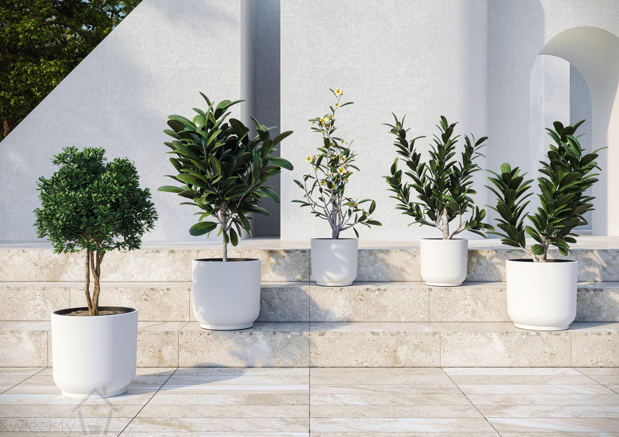 Doniczka jest w pięknym klasycznym kolorze białym. Biel odbija promienie słoneczne, więc ten kolor świetnie sprawdzi się na ekspozycji południowej. Pozwoli, aby wilgoć z doniczek nie odparowywała tak szybko, a korzenie i ziemia nie nagrzewały się zbytnio. Wpasuje się do każdej przestrzeni, nowoczesnej klasycznej. Pięknie będzie prezentowała się w grupie z mniejszymi donicami jak i solo.