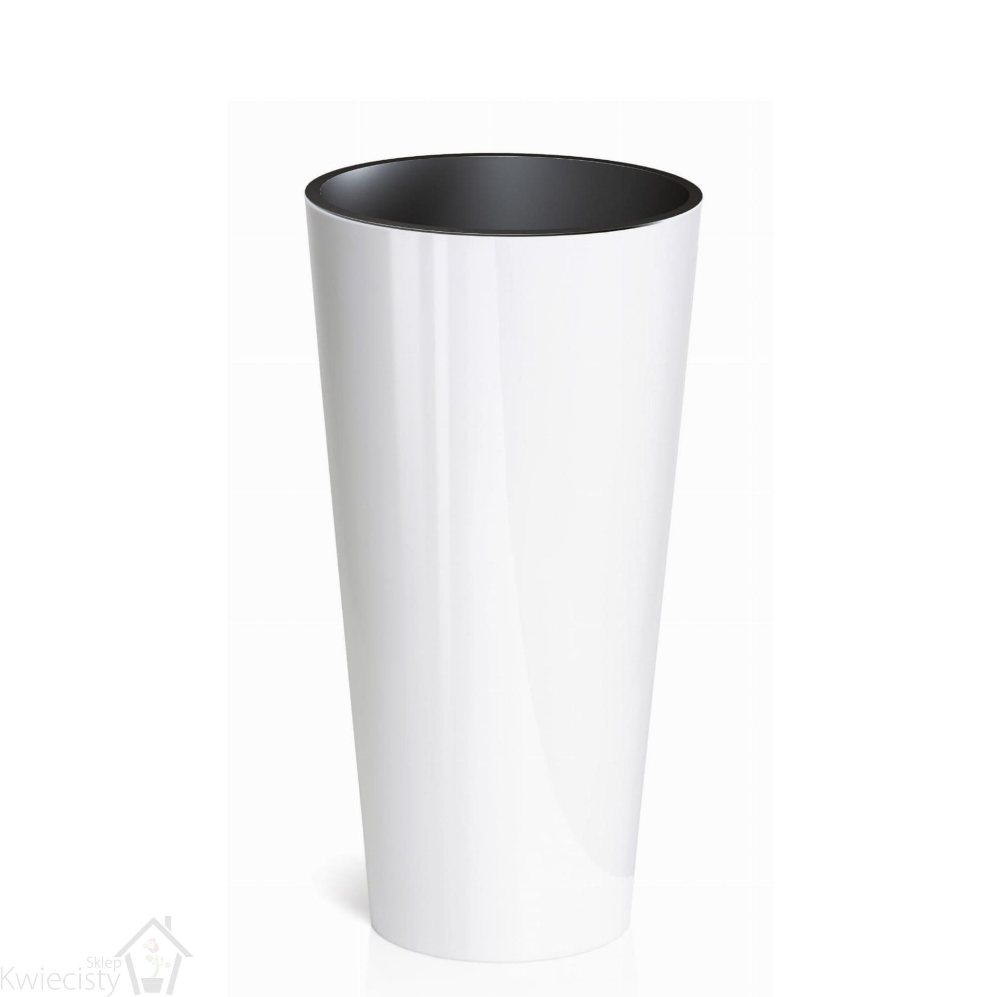 Okrągłe, wysokie doniczki z tworzywa sztucznego o błyszczącej powierzchni.