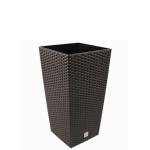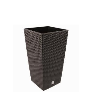 Kwadratowe, wysokie doniczki z tworzywa sztucznego o rattanowym wyglądzie z wkładem wewnętrznym. Wymiary: 26,5x26,5x50 cm. Pojemność: 26,6 l. Wybór kolorów.