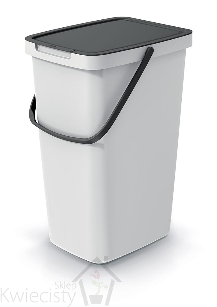 - Wybierając tę ofertę kupujesz kosz na śmieci w kolorze popielatym (jasnym szarym) z klapą i rączką w kolorze czarnym