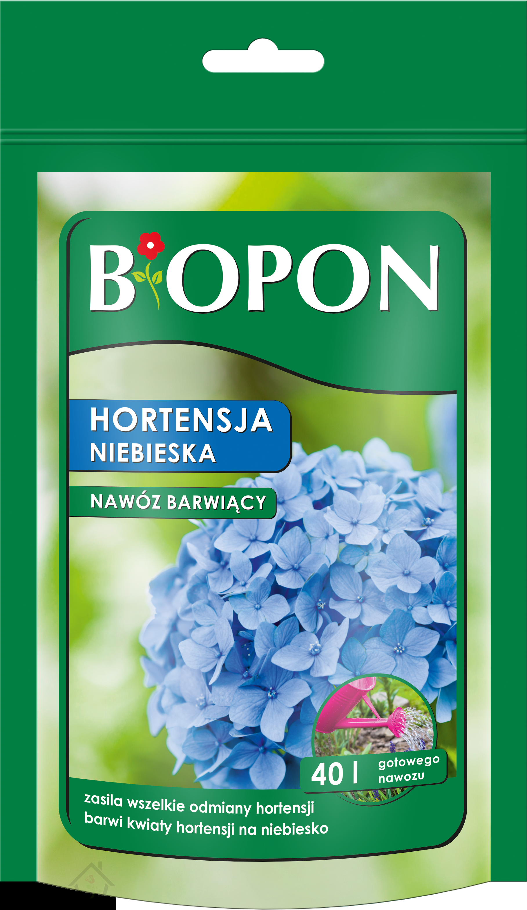 Barwienie kwiatów hortensji: Nawóz jest specjalnie dostosowany do zmiany koloru kwiatów hortensji na niebieski. Wnika w strukturę rośliny, zabarwiając jej kwiaty.