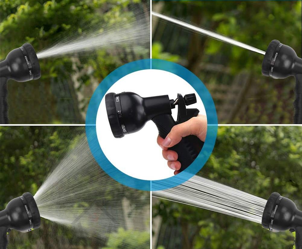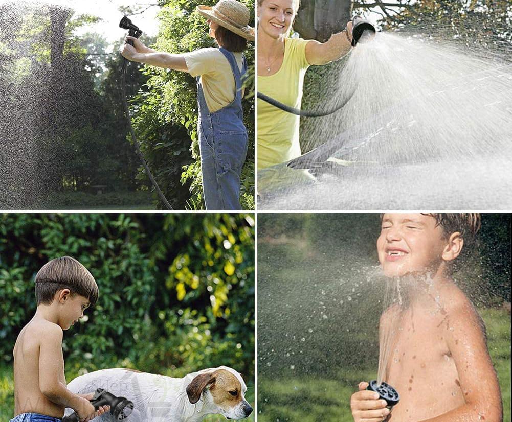 W zestawie z wężem znajduje się bardzo praktyczny spryskiwacz, posiadający aż 8 trybów. Z jego pomocą podlejemy trawnik, kwiaty, wykąpiemy zwierzęta domowe oraz umyjemy samochód. Regulacja ciśnienia wody może odbywać się na dwa sposoby: za pomocą śruby zaworu, oraz ruchomej rączki. Pistolet posiada również funkcję blokady