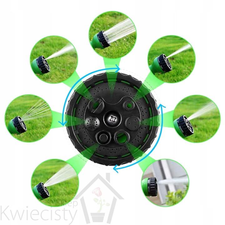 W zestawie z wężem znajduje się bardzo praktyczny spryskiwacz, posiadający aż 7 trybów.