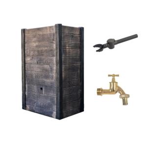Nowoczesny i stylowy zbiornik przyścienny na wodę deszczową w kształcie wysokiej, prostokątnej skrzyni imitującej drewno z metalowym, złotym kranikiem (GZ 3/4) i donicą.