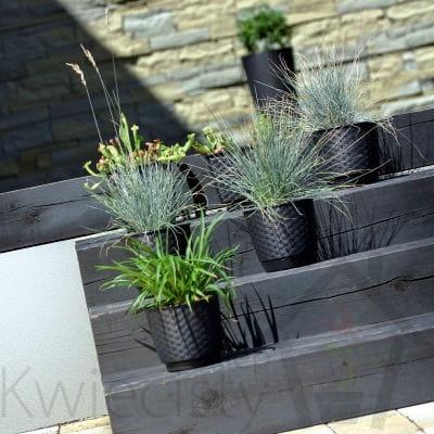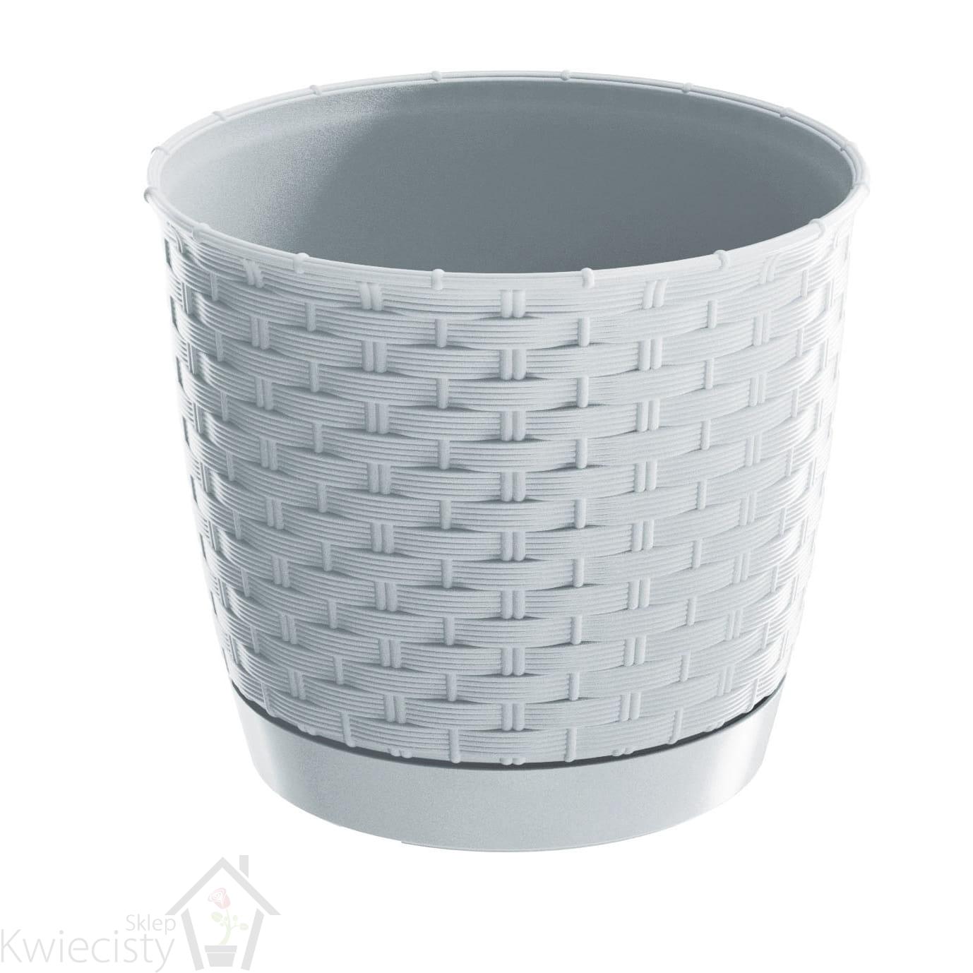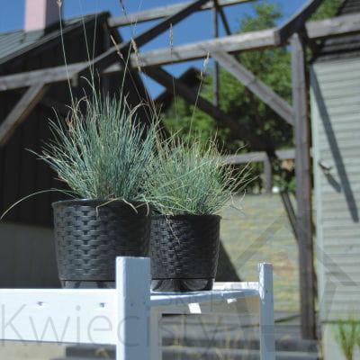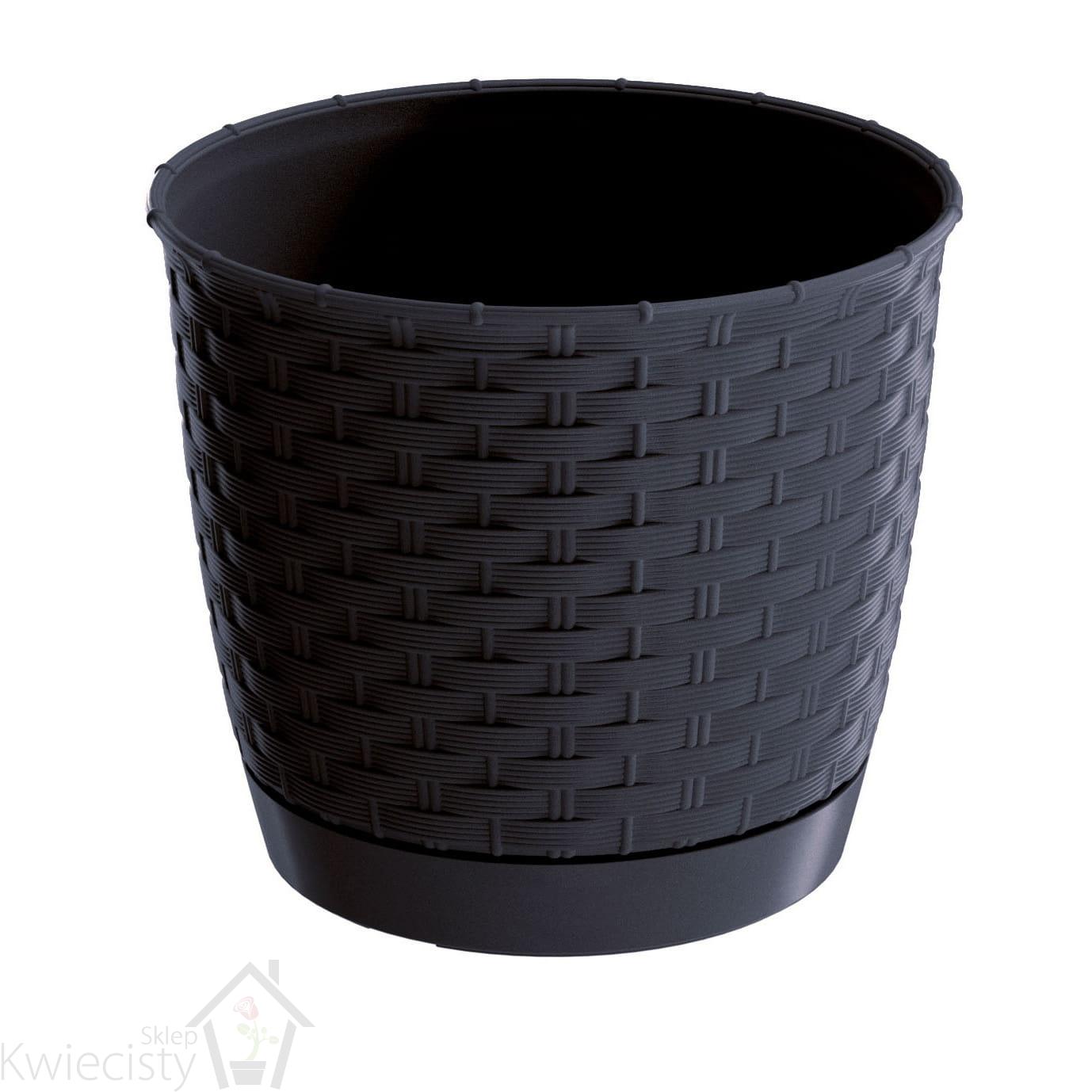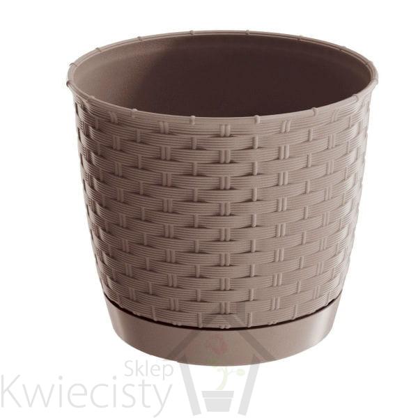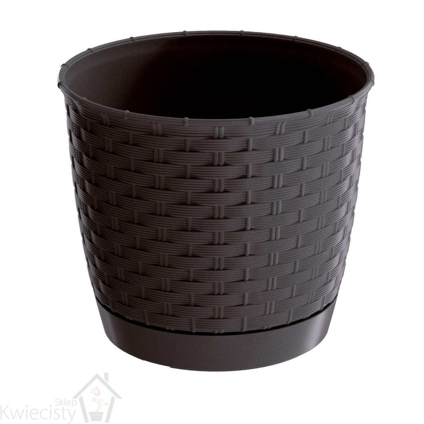 Okrągłe doniczki z tworzywa sztucznego o rattanowym wyglądzie. W komplecie z podstawką.