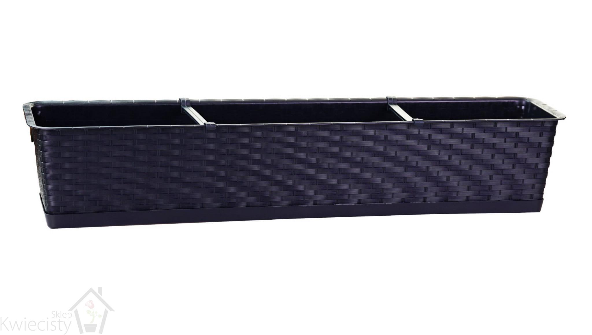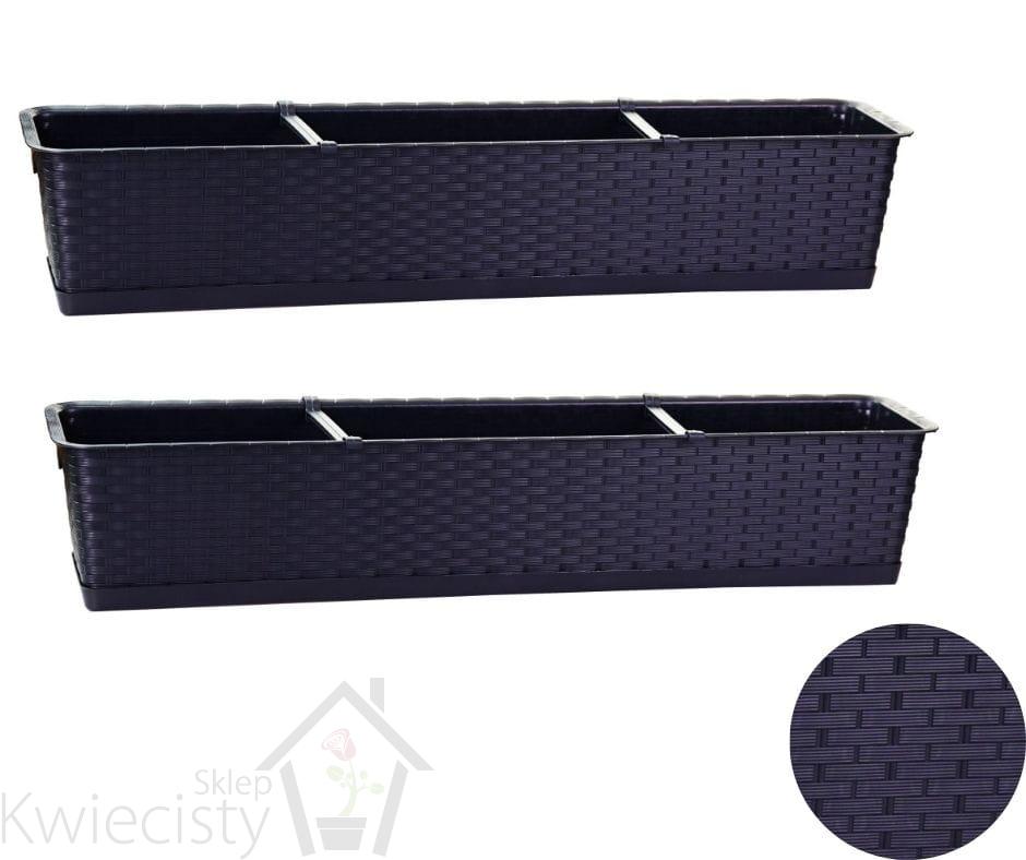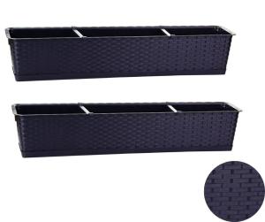 Podłużne doniczki z podstawką wykonane z tworzywa sztucznego o ratanowym wyglądzie, komplet 2 szt. Wymiary: 78x17x15 cm. Pojemność: 13,5 l. Wybór kolorów.