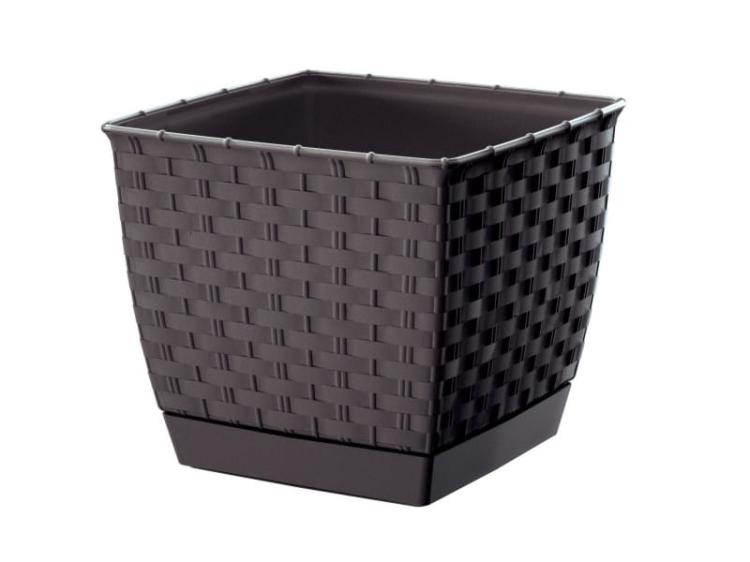Kwadratowe doniczki z tworzywa sztucznego o rattanowym wyglądzie z podstawką.