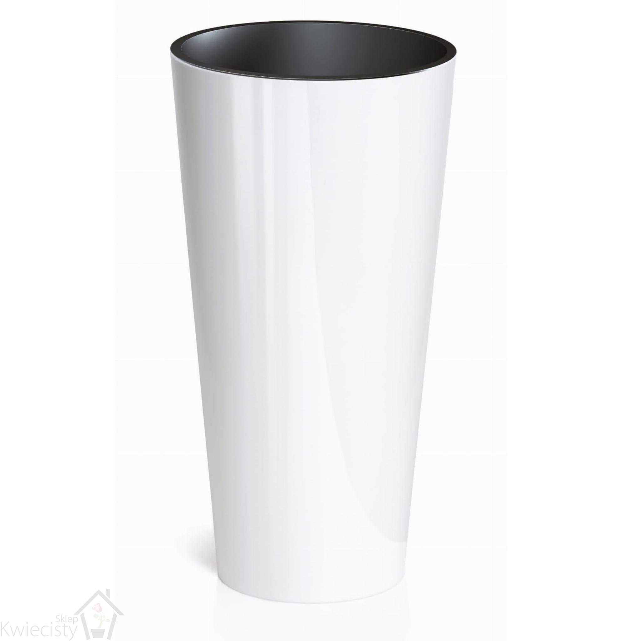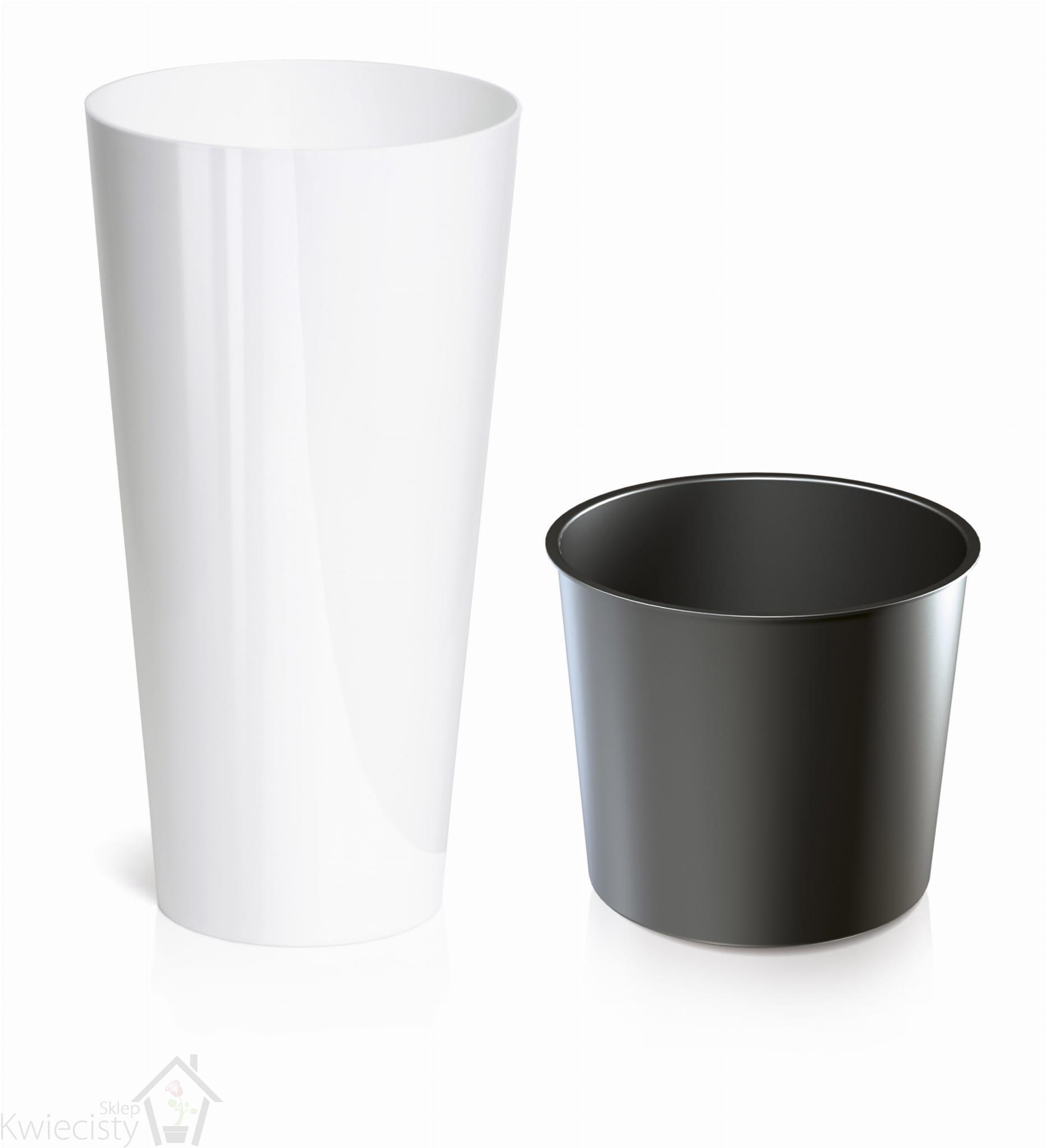 Okrągłe, wysokie doniczki z tworzywa sztucznego o błyszczącej powierzchni.