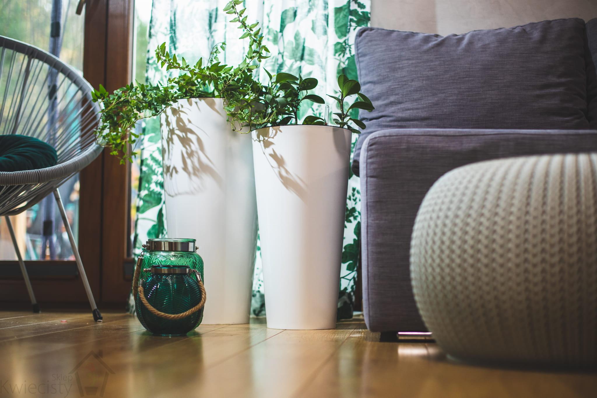 Wysoka, duża biała donica. Donica idealnie pasuję do dużych kwiatów, takich jak monstery, palmy czy zamiokulkasy. Biała doniczka, w połysku z wkładem. Wysoka biała kwadratowa doniczka z wkładem w komplecie. Doniczka z plastiku wytrzymałego na promienie UV i inne warunki.