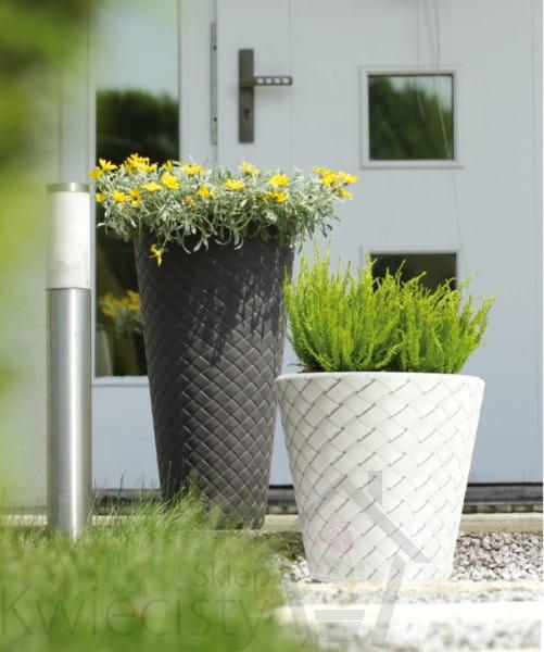 Doniczki, o bardzo nowoczesnym designie, imitująca bambusową plecionkę. Wykonane z wysokiej jakości tworzywa sztucznego, odpornego na warunki atmosferyczne oraz promienie UV.