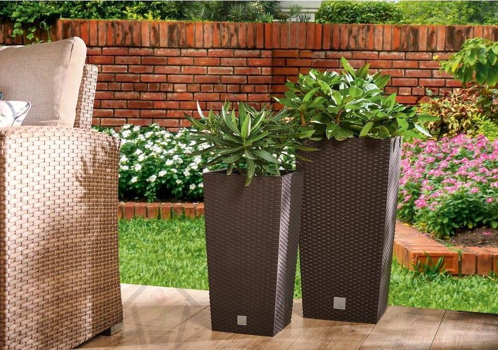 Wysokiej jakości doniczki z tworzywa sztucznego o rattanowym wyglądzie z wkładem wewnętrznym i systemem do nawadniania. Wymiary: 26,5x26,5x50 cm. Pojemność: 26,6 l. Wybór kolorów.