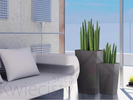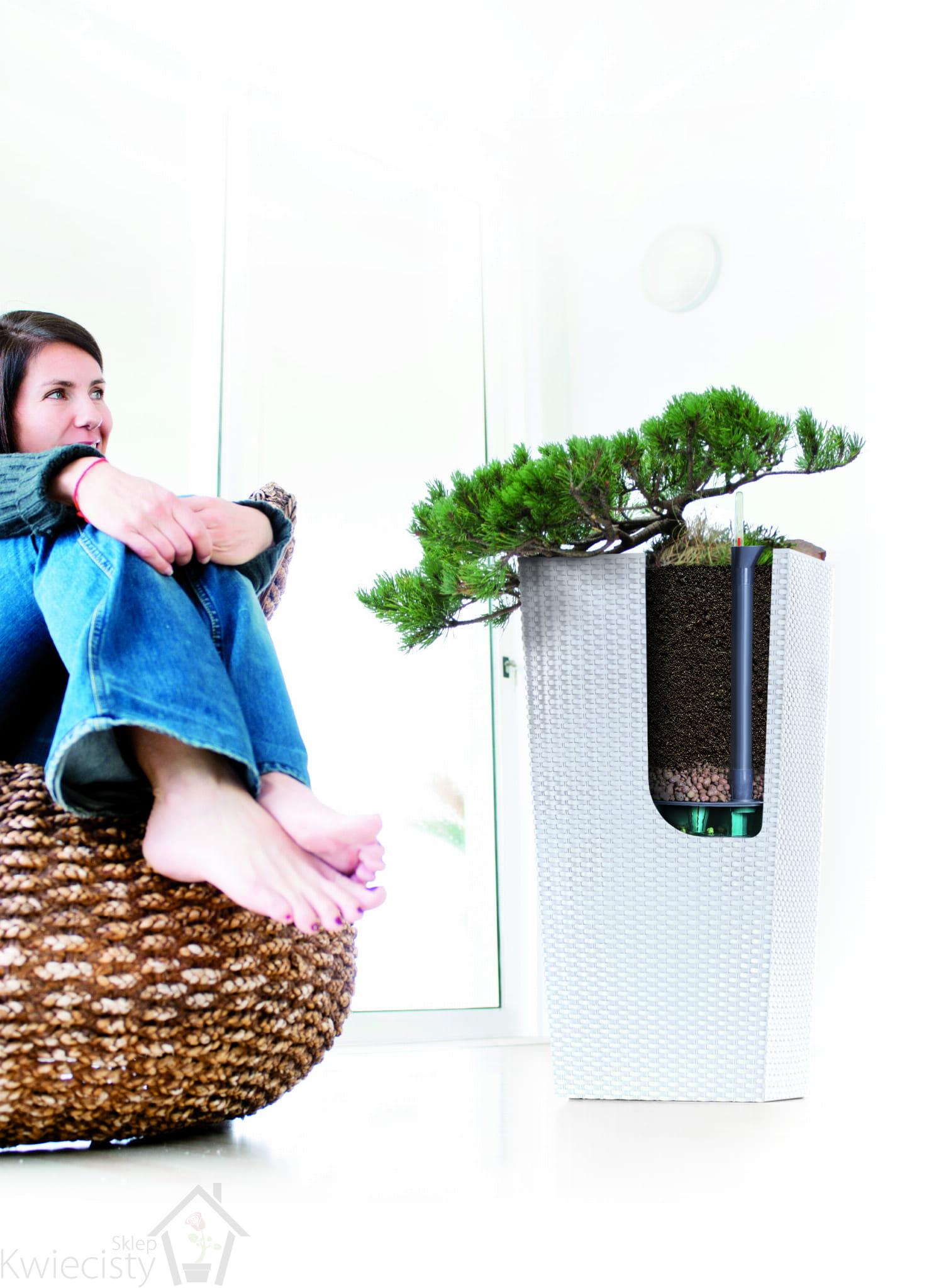 Wysoka doniczka Rato Square o fakturze wiernie imitującej plecionkę z naturalnego rattanu, pozwala kreować piękne, unikatowe wnętrza i bez ograniczeń aranżować przestrzeń wokół domu. W zestawie z nawadnianiem