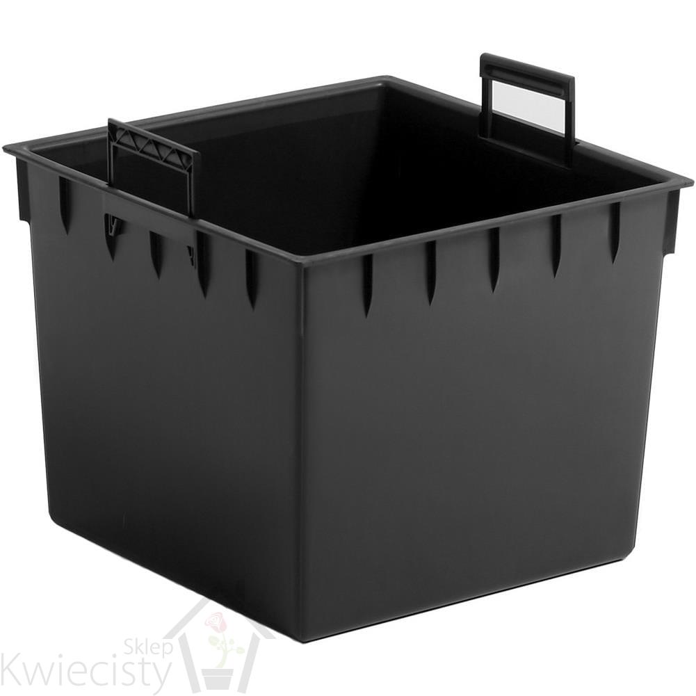 Wkład wewnętrzny (czarny kwadrat z uchwytami) pozwala oszczędzić ziemię, zamiast wsypywać ją do całej doniczki wypełniamy jedynie wkład. Mimo to roślina ma sporo miejsca do wzrostu. We wkładzie nie ma otworów.