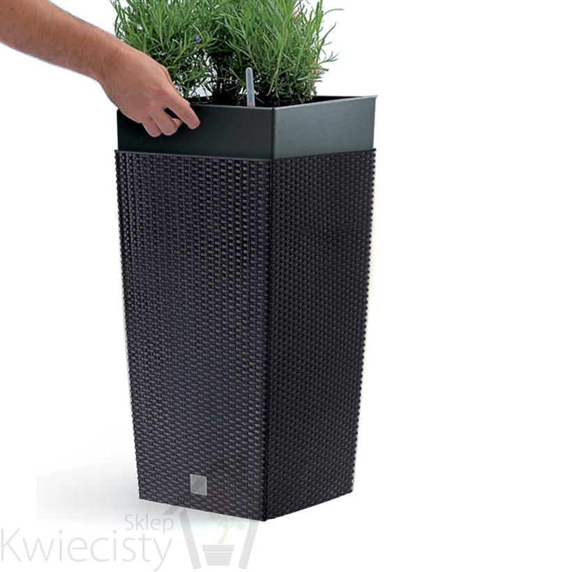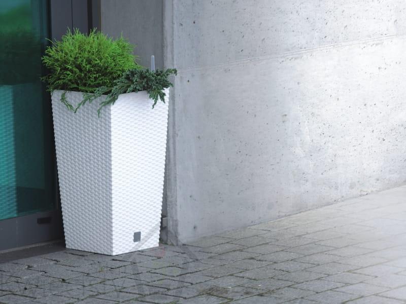 Wysoka doniczka Rato Square o fakturze wiernie imitującej plecionkę z naturalnego rattanu, pozwala kreować piękne, unikatowe wnętrza i bez ograniczeń aranżować przestrzeń wokół domu. W zestawie z nawadnianiem