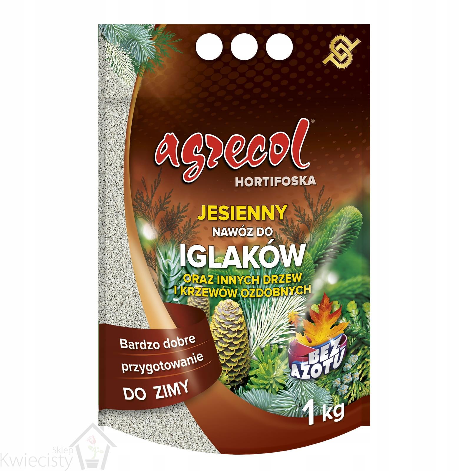 Hortifoska nawóz jesienny do iglaków oraz innych drzew i krzewów ozdobnych to granulowany nawóz potasowo-magnezowy, przeznaczony do jesiennego nawożenia wszelkich gatunków roślin iglastych. Doskonale sprawdza się również w uprawach ozdobnych drzew i krzewów liściastych, ponieważ nie powoduje zmiany odczynu podłoża. Nawóz służy przede wszystkim przygotowaniu roślin na trudne zimowe warunki. Nawozy jesienne warto zacząć już stosować latem (nawet od lipca, zamiast nawozów azotowych).