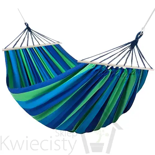 - Specyfikacja - kolor: niebiesko/zielony; materiał: bawełna + poliester, pozostałe: drewno + nylon + pokrowiec: materiał: bawełna + poliester, pozostałe: nylon; maksymalne obciążenie: 150 kg; długość stelaża drewnianego: 82 cm; wymiary materiału (dł/szer) 180x160cm; wymiary całości (dł/szer): 260x160cm; waga:1,788 kg, waga w opakowaniu: 1,804 kg.