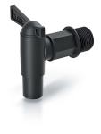 Kran z gwintowanym otworem o średnicy 26 mm, uszczelką i plastikową nakrętką.
