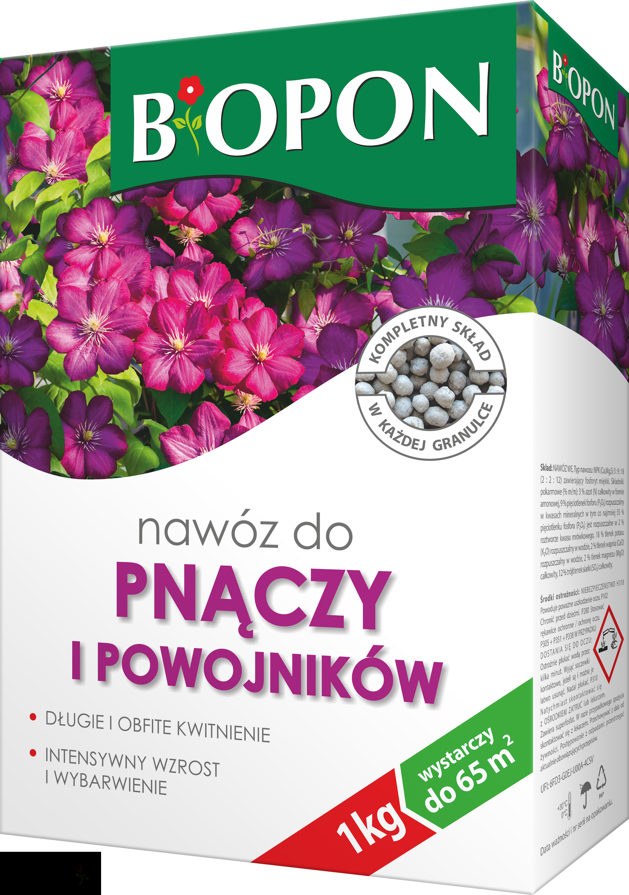 Wieloskładnikowy nawóz w postaci granulatu przeznaczony do zasilania wszystkich odmian powojników, bluszczy, winobluszczy i innych pnączy. Odpowiednio dobrany zestaw składników mineralnych stwarza optymalne warunki rozwoju.