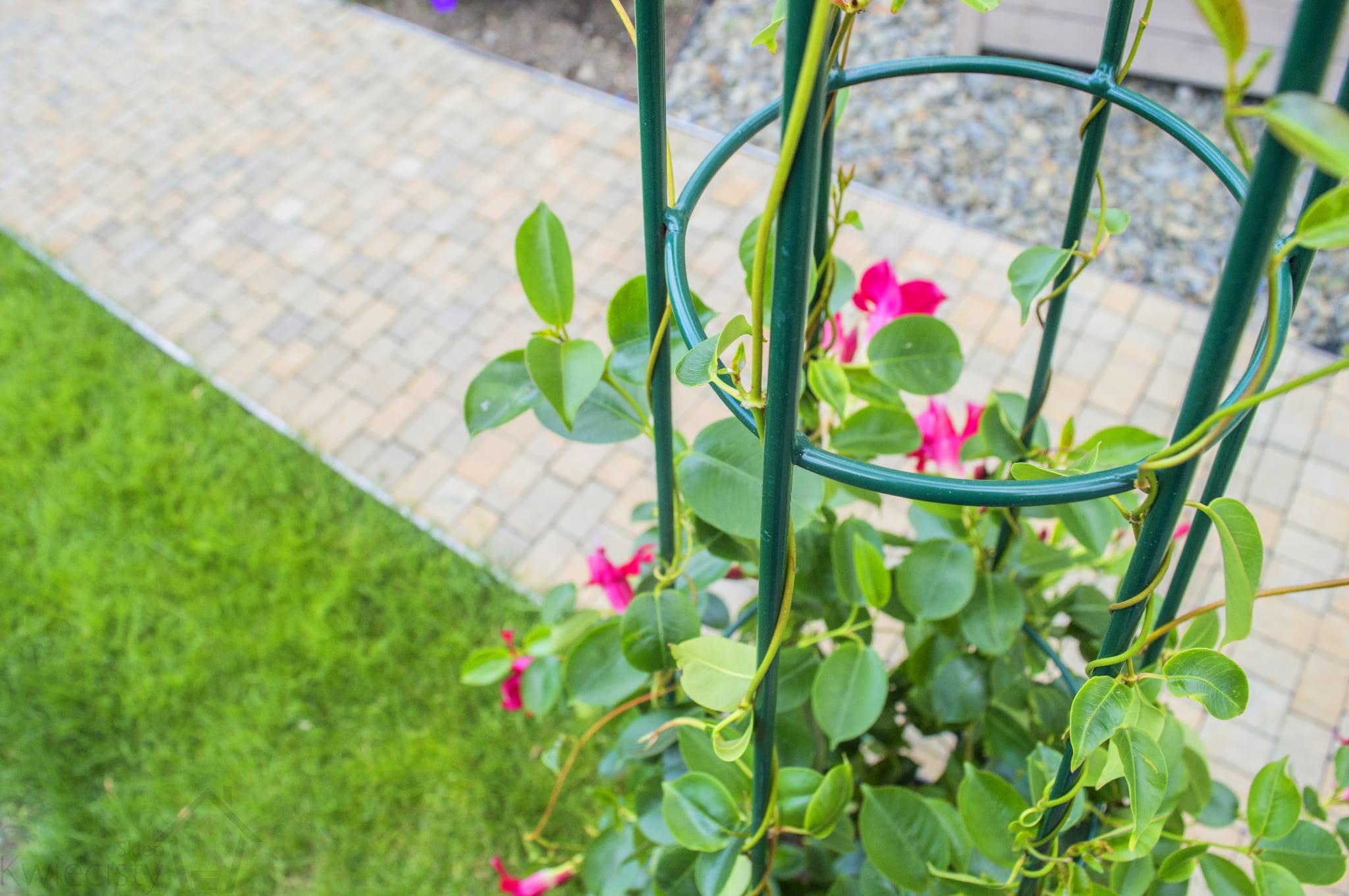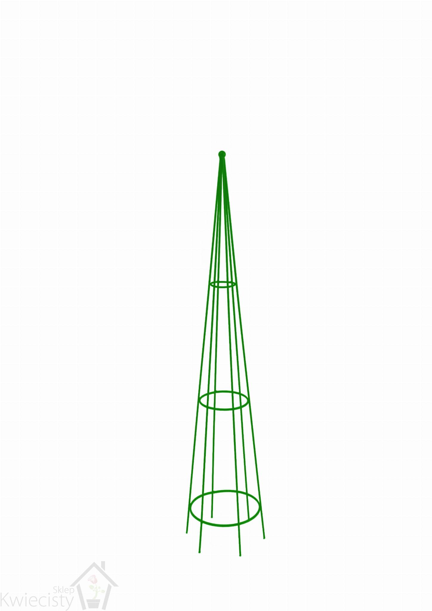 Podpora ogrodowa w kształcie stożka, o wysokości 150 cm w kolorze ciemnozielonym to masywna i wysoka konstrukcja pod pnącza w ogrodzie.