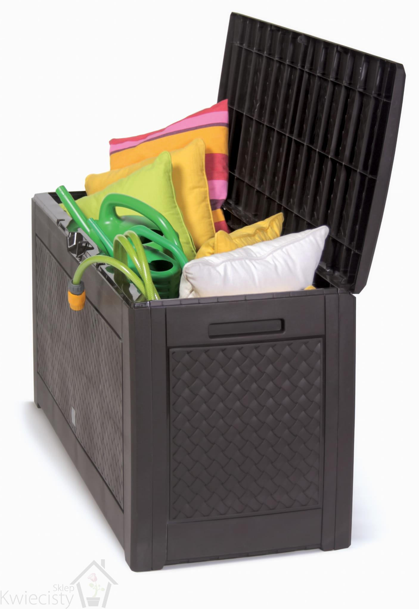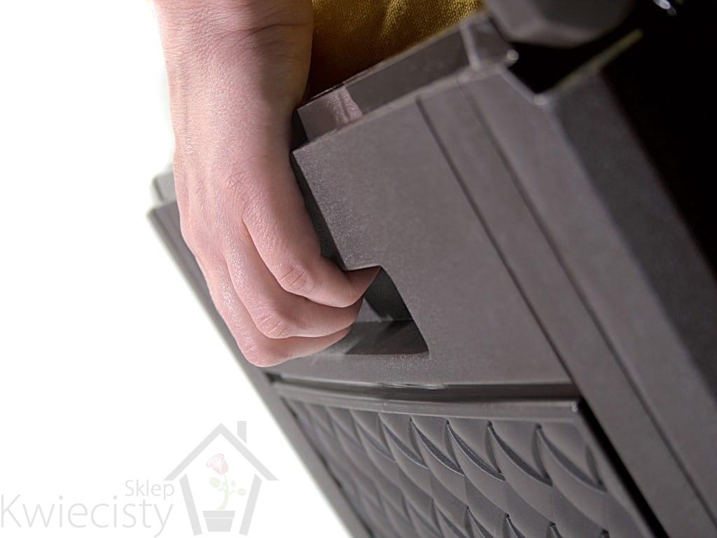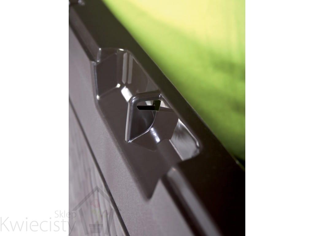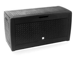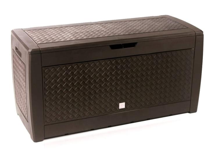 Skrzynia posiada wygodne uchwyty i rolki ułatwiające przemieszczanie skrzyni. Produkt jest odporny na mróz, warunki atmosferyczne i promieniowanie UV. Może pozostawać na zewnątrz przez cały rok, ma dużą pojemność a otwierana klapa zapewnia łatwy dostęp do środka.