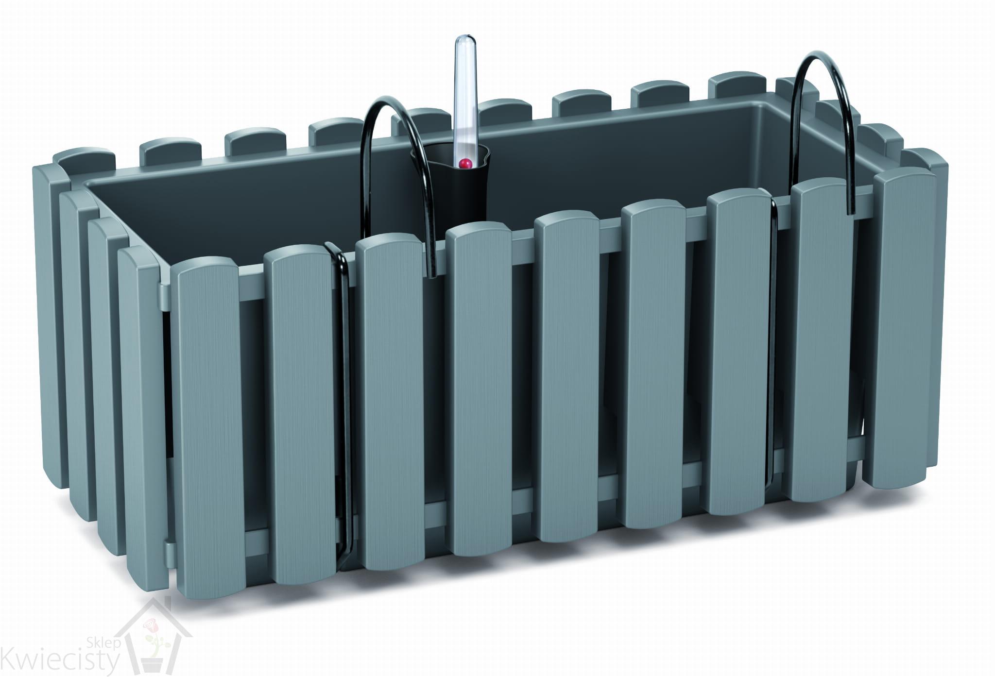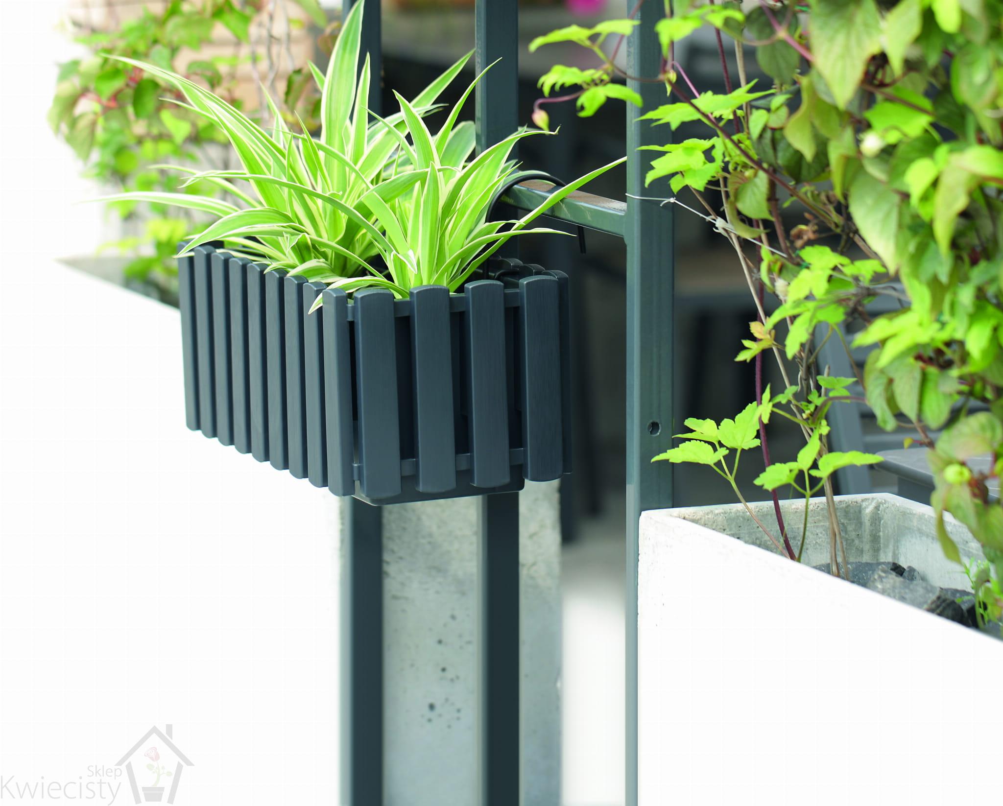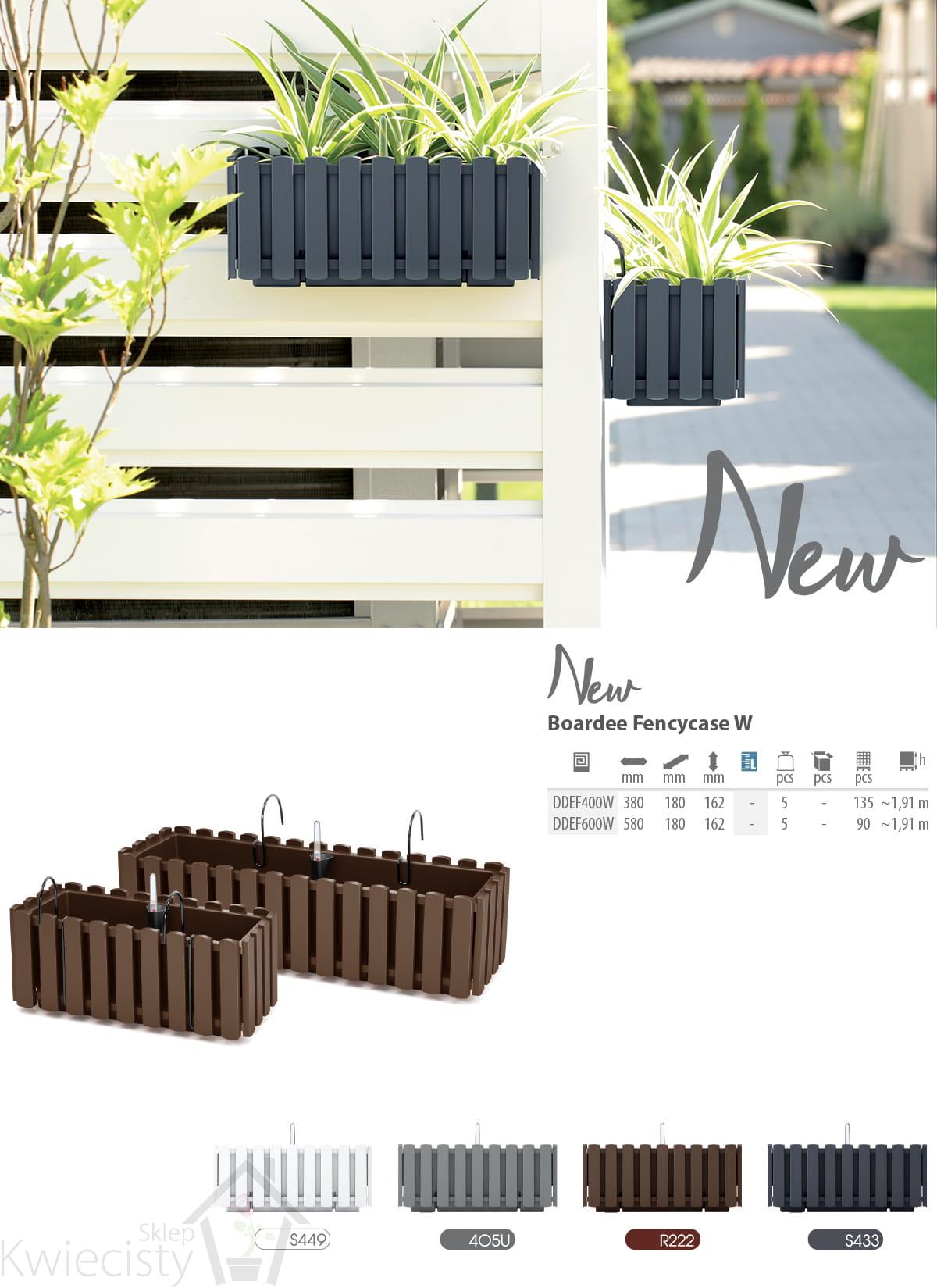 Skrzynka balkonowa Boardee Fencycase W wykonana z tworzywa sztucznego. Posiada system nawadniający oraz haczyki umożliwiające powieszenie doniczki. Zastosowanie do wewnątrz i na zewnątrz. Wymiary: 38x18x16,2cm. Wybór kolorów.