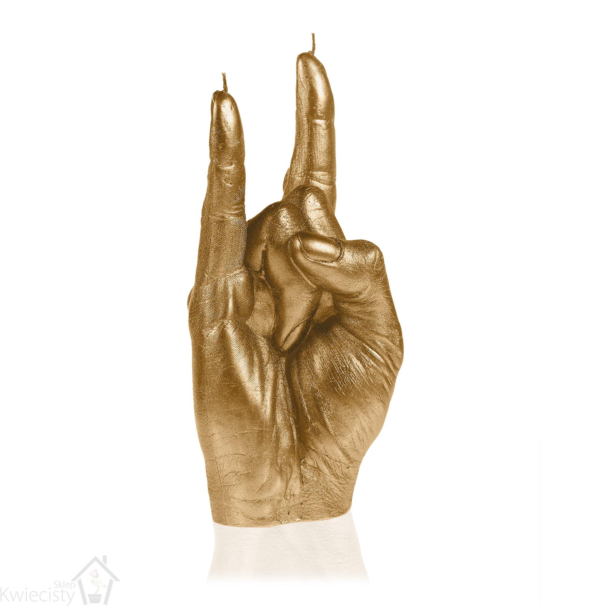 Świeca ozdobna Hand RCK marki Candellana w kolorze Classic Gold to połączenie klasycznego blasku z wyrazistym, rockowym akcentem. Wykonana w kształcie dłoni pokazującej znak "rock on", świeca ta doskonale komponuje się z wnętrzami urządzonymi w stylu glamour, klasycznym oraz nowoczesnym. To idealny wybór dla tych, którzy chcą dodać swojemu wnętrzu niepowtarzalnego charakteru.
