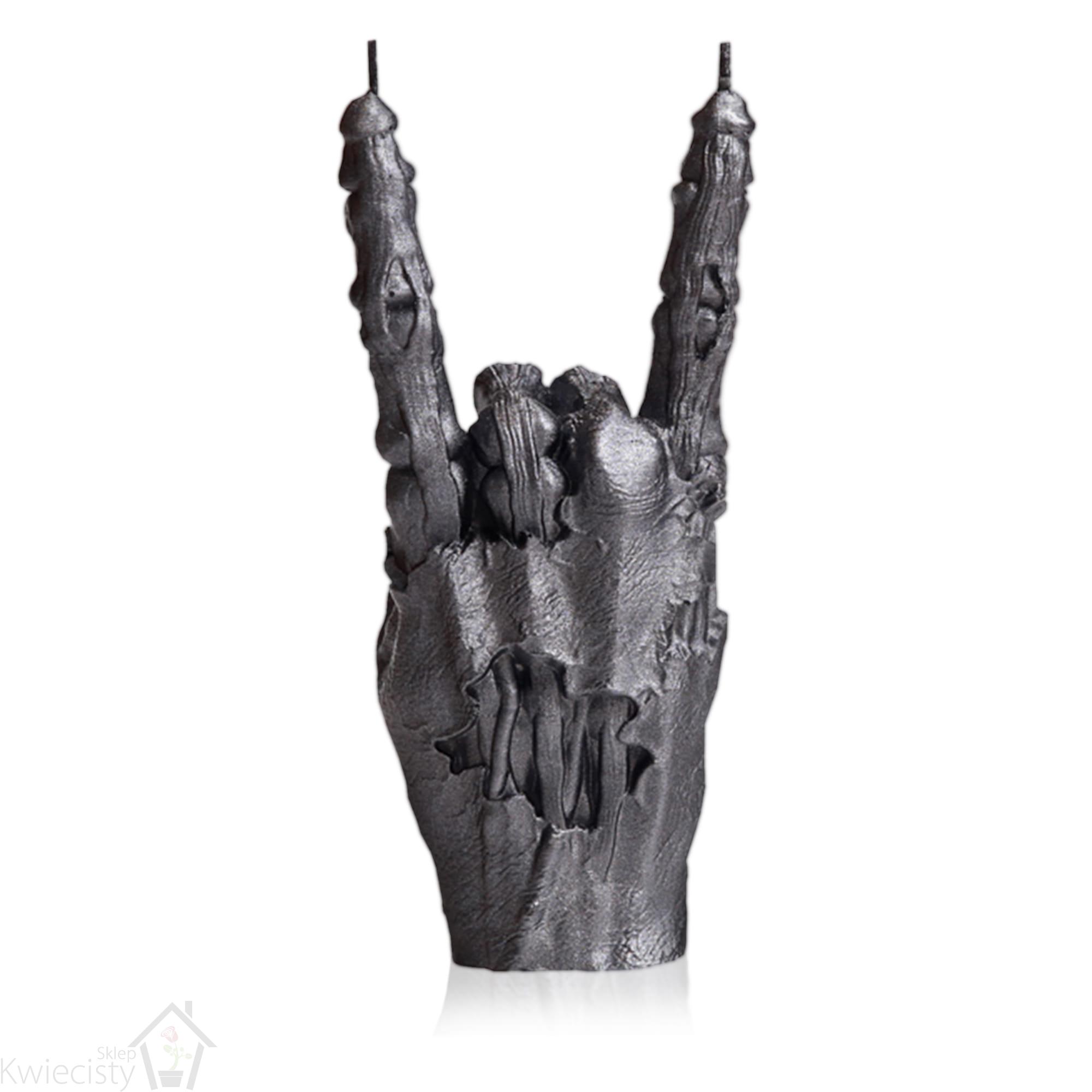 Świeca ozdobna Zombie Hand RCK marki Candellana w kolorze Steel to unikalna dekoracja, która wnosi do wnętrza mroczny i surowy charakter. Wykonana w kształcie ręki zombie pokazującej znak "rock on", świeca ta jest idealnym wyborem dla miłośników postapokaliptycznych klimatów oraz industrialnych aranżacji wnętrz.