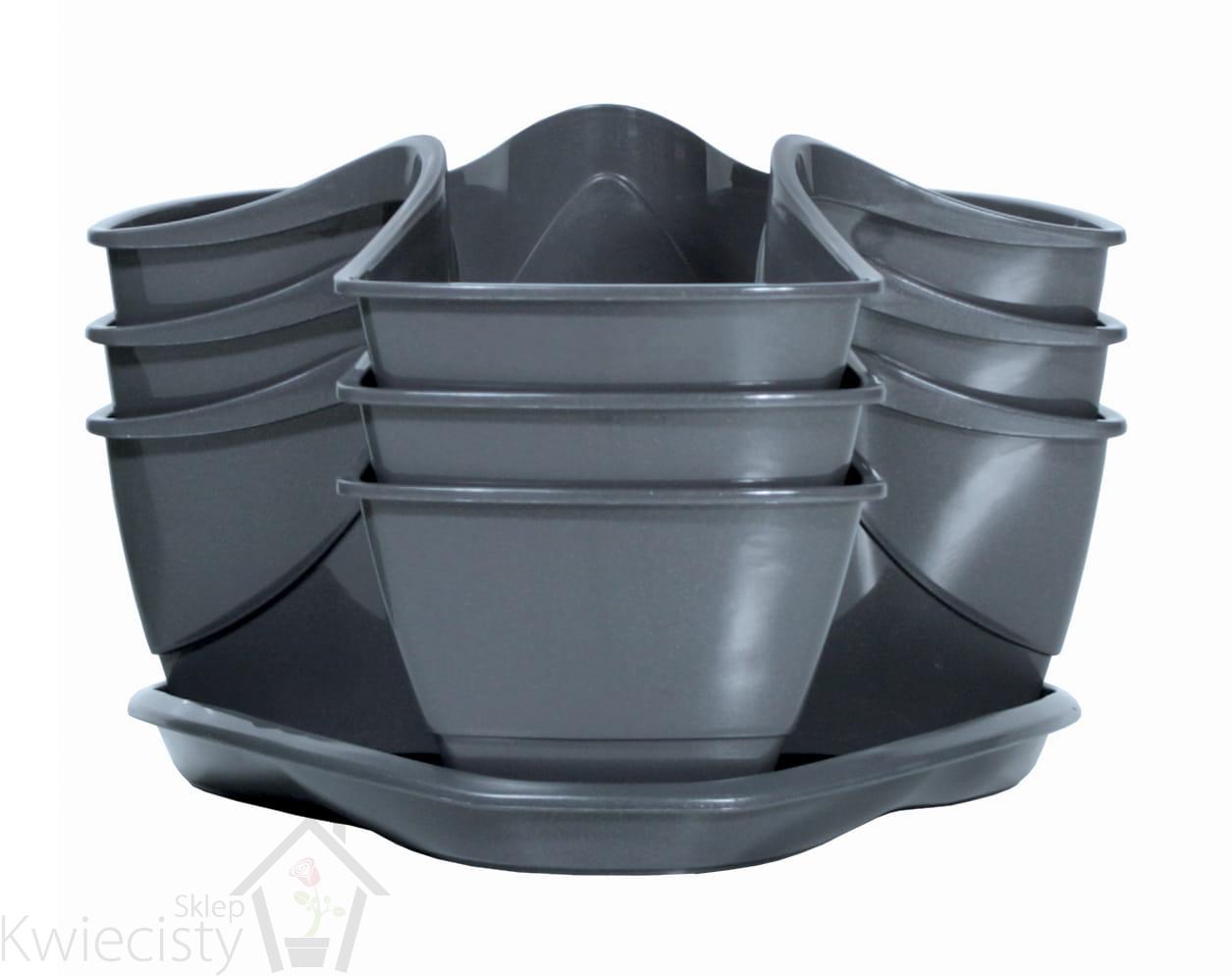 Potrójna, składana doniczka Coubi Herbal. Kształt każdej z doniczek jest dopasowany w taki sposób, aby każdy z poszczególnych elementów do siebie pasował. Konstrukcja nie wymaga dodatkowych narzędzi. W najniższej kondygnacji znajduje się także podstawka, która zapobiega wyciekaniu wody oraz utrzymuje zestaw w stabilnej, odpowiedniej pozycji.