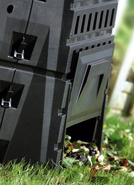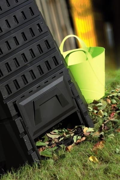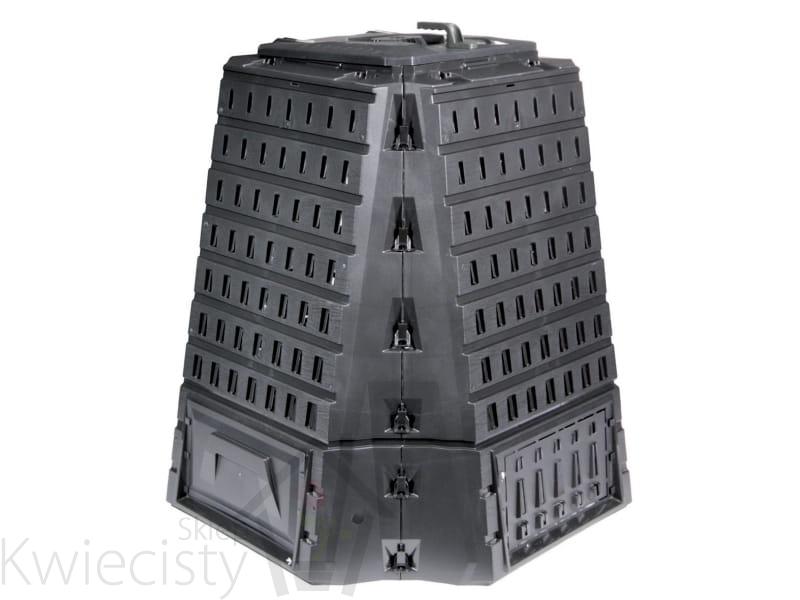 Wytrzymały kompostownik o pojemności 900 litrów, z dolną klapą ułatwiającą wyjmowanie kompostu.